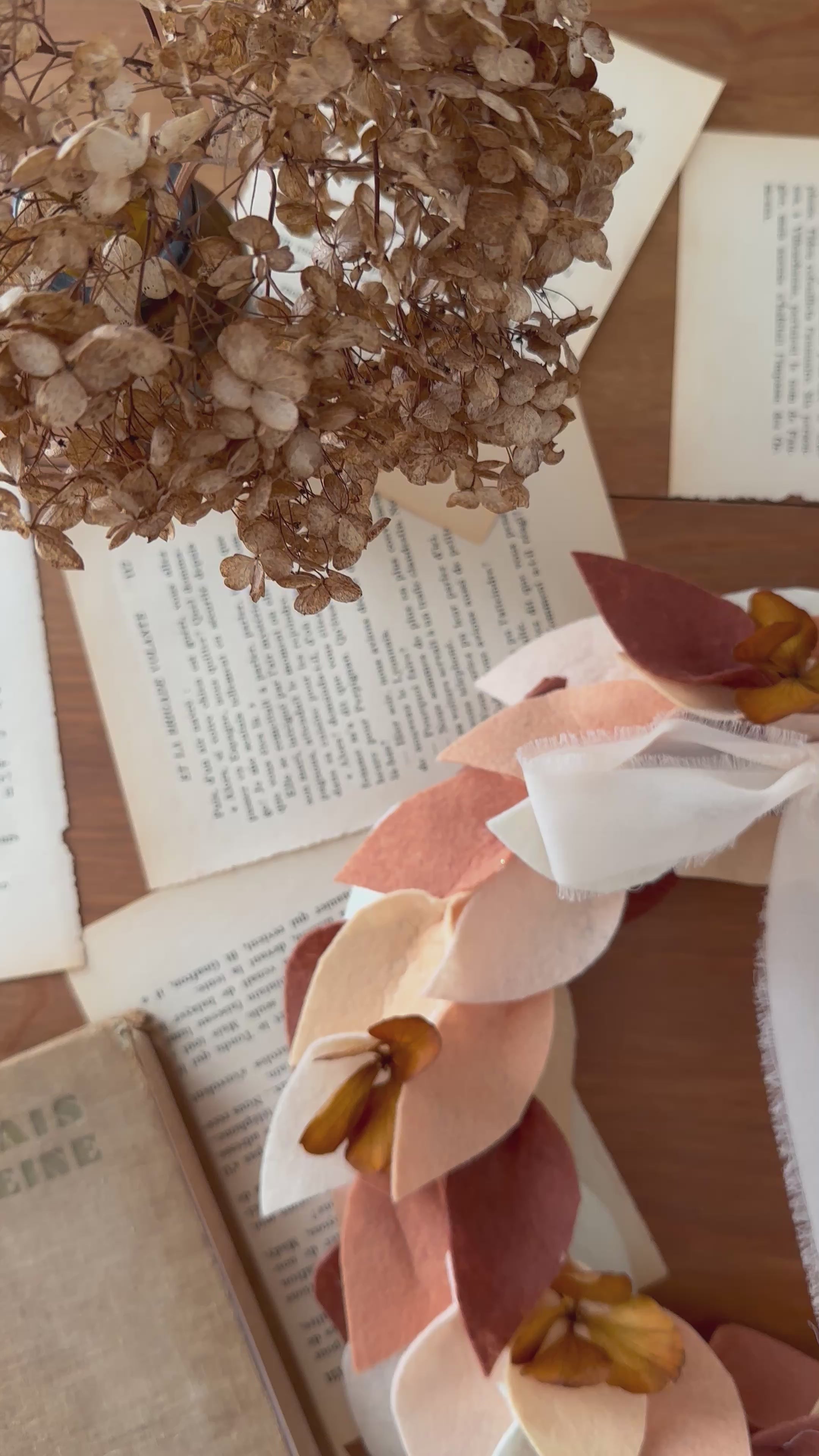 Chaque pétale de cette couronne a été découpé un à un puis assemblé à la main pour créer une pièce unique, empreinte de poésie et de douceur automnale. Ses teintes chaudes et réconfortantes évoquent les forêts dorées, les balades de saison et la magie cocooning de l’automne.